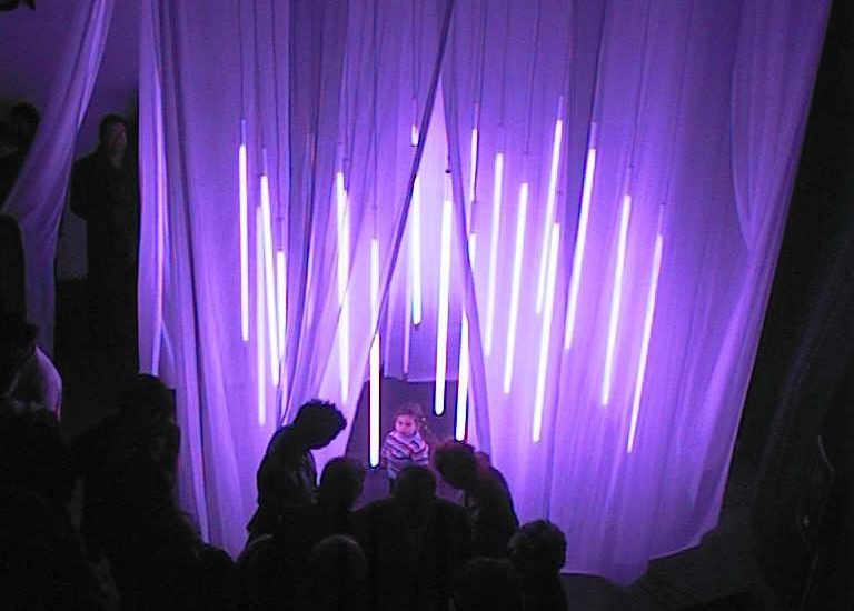 Welcome – Goodbye. A simple mass, a mysterious box, a radiant object. To enter and exit the exhibition, one must touch it, dive into it, and carve a path. Feeling the wind, swaying, scattering rays, desiring to overcome barriers—purifying by illuminating the eyes and touching the body.